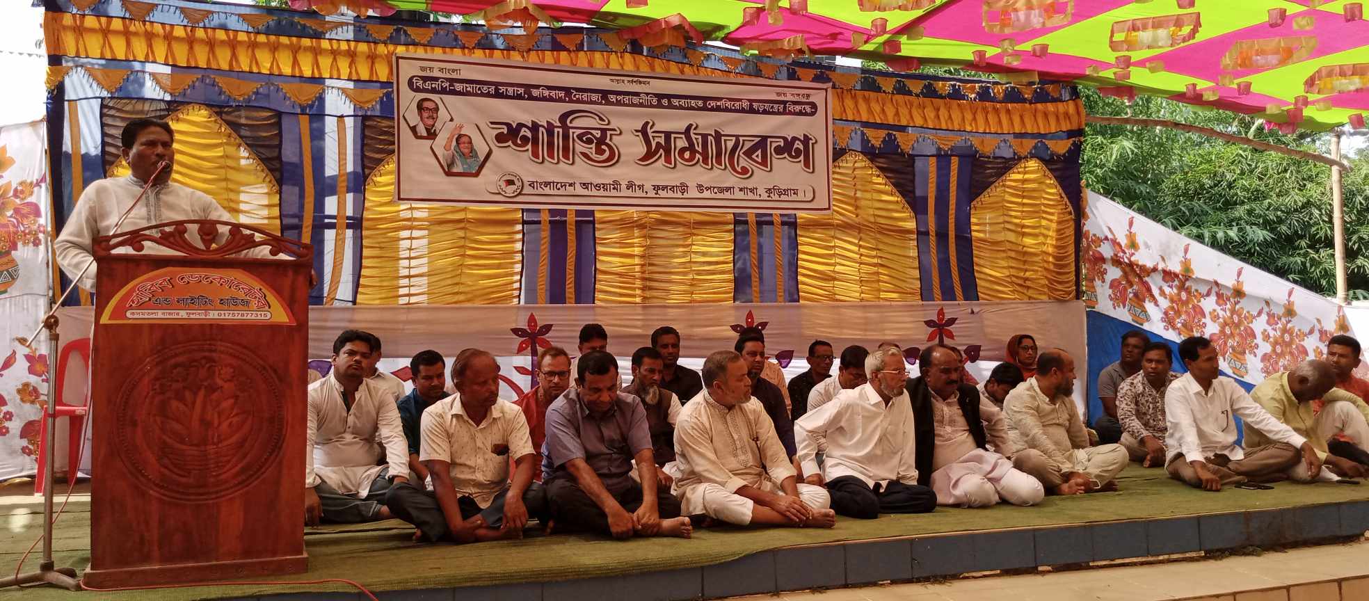 বিএনপি-জামাতের সন্ত্রাস জঙ্গিবাদ, নৈরাজ্য অপরানীতি ও অব্যাহত দেশবিরোধী ষড়যন্ত্রের বিরুদ্ধে কুড়িগ্রামের ফুলবাড়ীতে শান্তি সমাবেশ করেছে উপজেলা আওয়ামীলীগ। ২৮ অক্টোবর শনিবার সকাল সাড়ে এগারোটায় উপজেলার কেন্দীয় শহীদ মিনারে এ সমাবেশ অনুষ্ঠিত হয়।