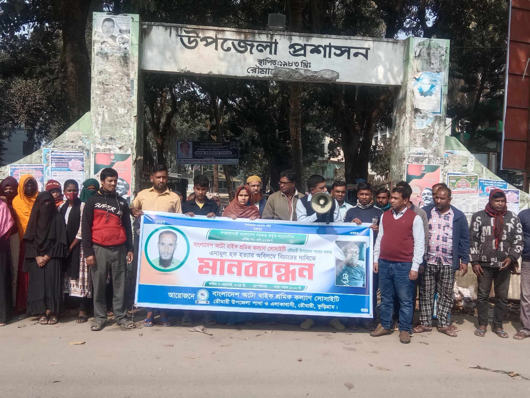 কুড়িগ্রামের রৌমাীতে অটোবাইক চালক এনামুল হত্যার প্রতিবাদ হত্যাকারীদের গ্রেফতারের দাবীতে মানববন্ধন করা হয়েছে অটোবাইক শ্রমিক সংগঠনের সদস্যরা।