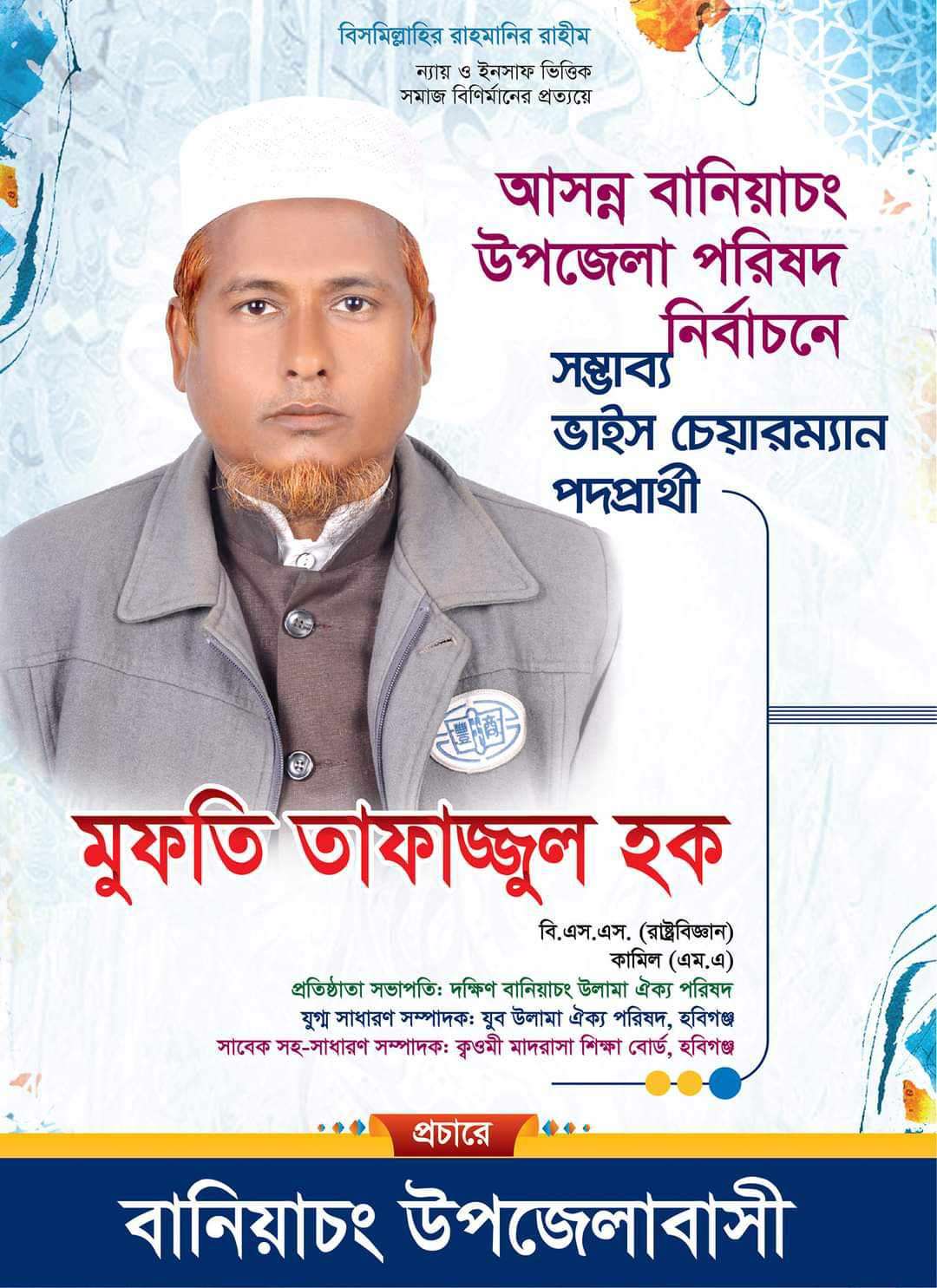 ইনসাফ ভিত্তিক সমাজ বিনির্মানের প্রত্যয়ের লক্ষে আগামী বানিয়াচং উপজেলা পরিষদ নির্বাচনে বানিয়াচং উপজেলা ভাইস চেয়ারম্যান পদে প্রার্থী হতে চান। নির্বাচনকে সামনে রেখে বিভিন্ন সভা সমাবেশে মতবিনিময় করে যাচ্ছেন।