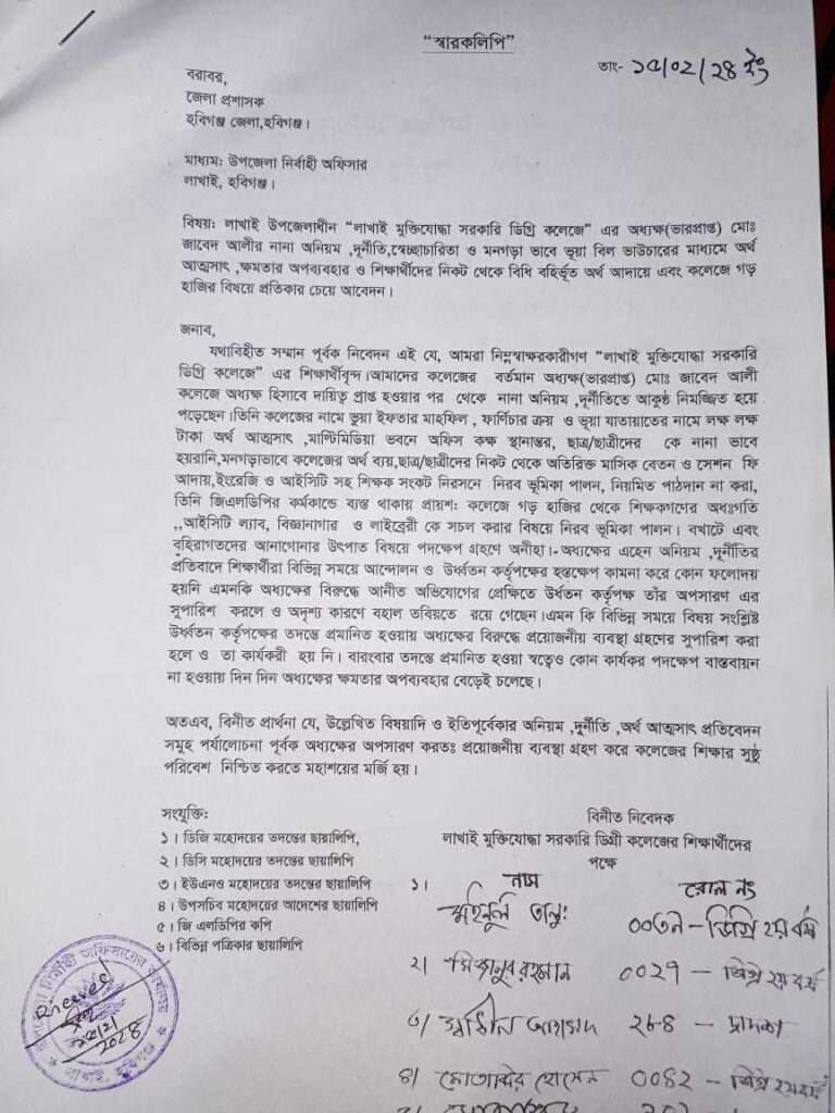 লাখাইয়ে মুক্তি যোদ্ধা সরকারি ডিগ্রি কলেজের অধ্যক্ষ মোঃ জাবেদ আলীর নানা অনিয়ম, দূর্নীতি,স্বেচ্ছাচারিতার প্রতিকার চেয়ে জেলা প্রশাসক বরাবর স্মারক লিপি প্রদান করেছে কলেজের শিক্ষার্থীরা।