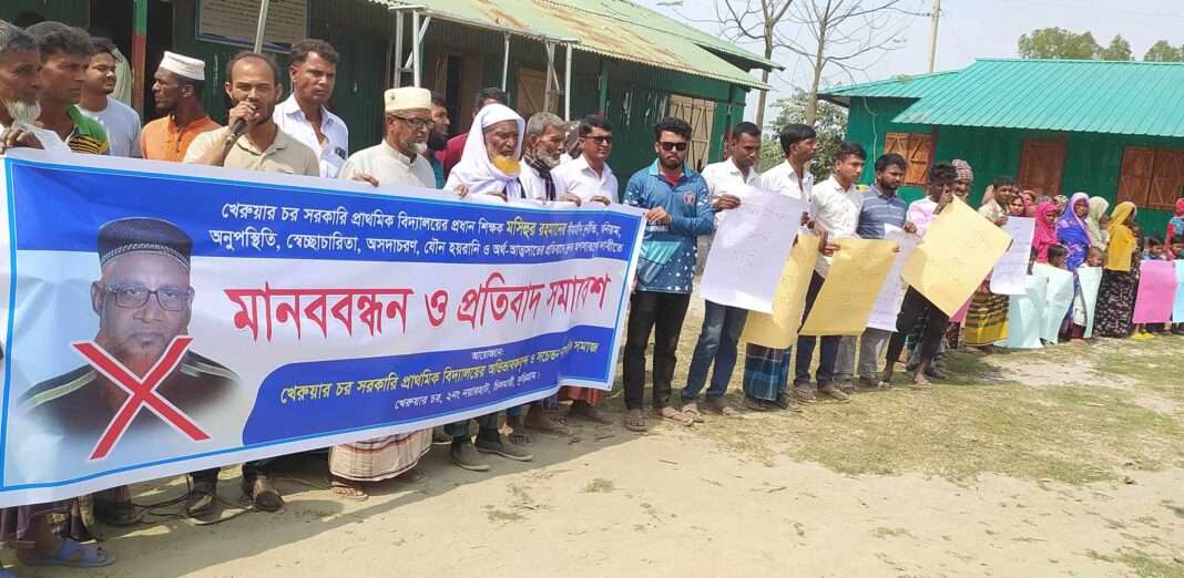 কুড়িগ্রামের চিলমারী উপজেলার খেরুয়ারচর সরকারি প্রাথমিক বিদ্যালয়ের প্রধান শিক্ষক মশিহুর রহমানের বিরুদ্ধে সীমাহীন অনিয়ম ,দুর্নীতি অনুপস্থিতি, সেচ্ছাচারিতা, অসাদাচারণ, যৌন হয়রানি ও অর্থ আত্মসাতের প্রতিবাদে এবং জরুরী অপসারণের দাবীতে বিক্ষোভ ও মানববন্ধন করা হয়।