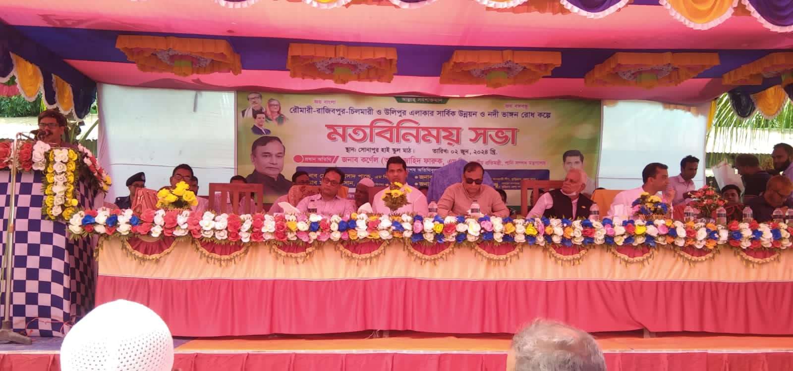 পরে এক মতবিনিময় সভায় প্রধান অথিতি হিসেবে বক্তব্য রাখেন। এ সময় উপস্থিত ছিলেন, কুড়িগ্রাম-৩ আসনের এমপি সৌমেন্দ প্রসাদ পান্ডে, গাইবান্দা-৫ আসনের এমপি মাহমুদ হাসান রিপন, অতিরিক্ত সচিব পানি সম্পদ মন্ত্রনালয় ড.আ.ল.ম বজলুর রশিদ, রংপুর বিভাগের প্রধান প্রকৌশলী মাহবুবর রহমান, রৌমারী উপজেলা পরিষদ চেয়ারম্যান শহিদুল ইসলাম শালু, বীরমুক্তিযোদ্ধা আলহাজ্ব আব্দুল কাদের সরকার, শৌলমারী ইউপি চেয়ারম্যান নজরুল ইসলাম, রাজিবপুর উপজেলা আওয়ামীলীগের সাধারণ সম্পাদক হুমায়ুন কবীর ছক্কুসহ অনেকেই।