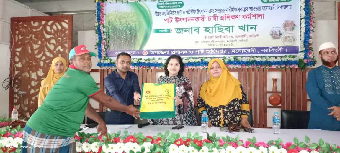“সোনালী আঁশের সোনার দেশ” পরিবেশ বান্ধব বাংলাদেশ।” পাট শিল্পের অবদান,”স্মার্ট বাংলাদেশ বিনির্মাণ”এই স্লোগানে নরসিংদীর মনোহরদীতে উপজেলা প্রশাসন ও পাট অধিদপ্তর কর্তৃক আয়োজিত উন্নত প্রযুক্তিনির্ভর পাট ও বীজ উৎপাদন এবং সম্প্রসারণ শীর্ষক প্রকল্পের আওতায় দিনব্যাপী পাট উৎপাদনকারী চাষী প্রশিক্ষণ কর্মশালার উদ্বোধন করেন উপজেলা নির্বাহী কর্মকর্তা হাছিবা খান।