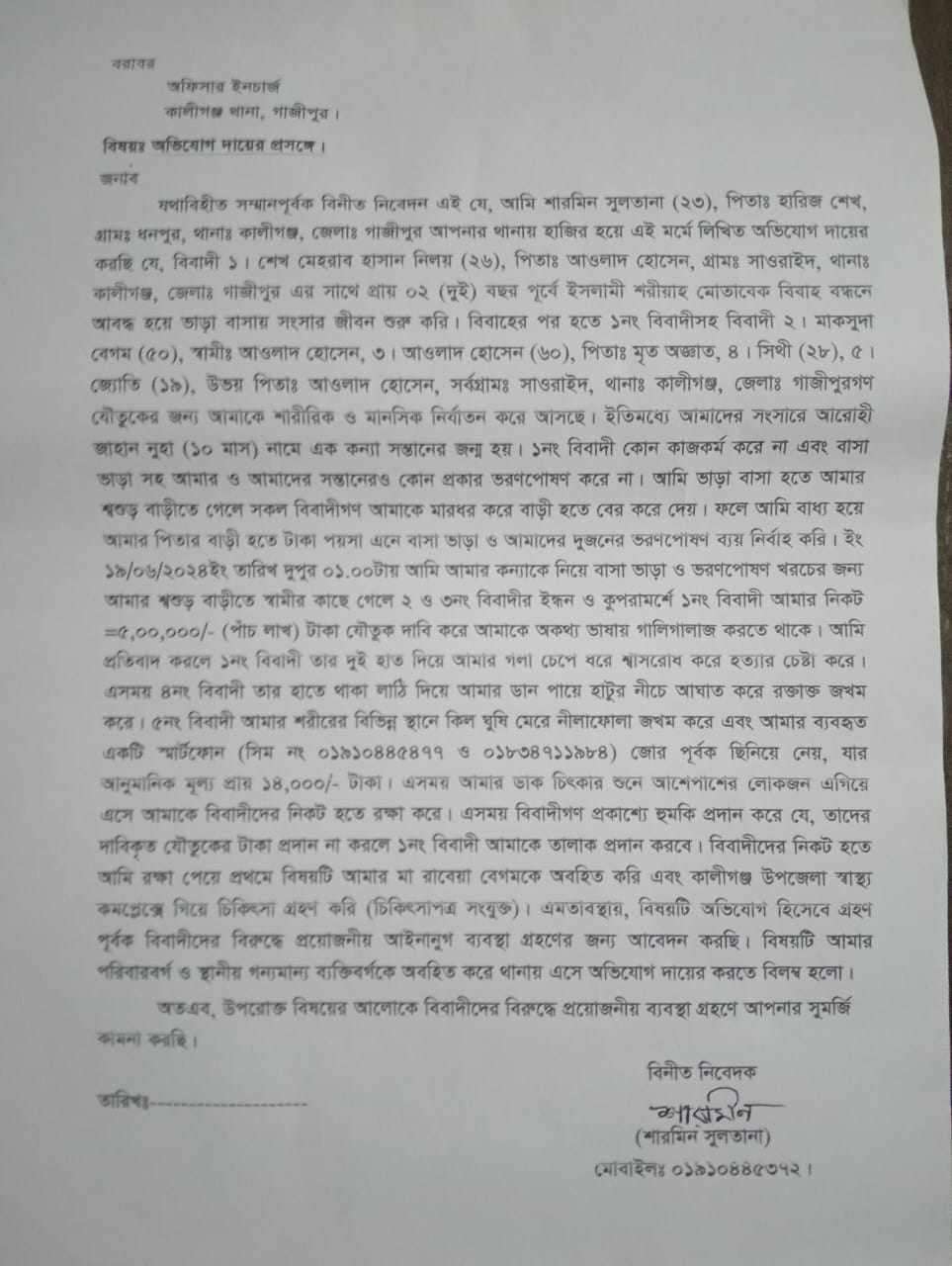 গত বুধবার (১৯ জুন) দুপুরে শারমিন শিশু কন্যাকে নিয়ে বাসা ভাড়া ও ভরণপোষণ খরচের জন্য শ্বশুড় বাড়ীতে গেলে নিলয়, তার বাবা আওলাদ হোসেন, মা মাকসুদা বেগম, দুই বোন সিথী ও জ্যোতি ৫ লাখ টাকা যৌতুকের দাবীতে তাকে শারিরীক নির্যাতন করে গলা চেপে শ্বাসরোধে হত্যার চেষ্টা করে। এসময় তারা শারমিনের ব্যবহৃত মোবাইল ফোনটি জোরপূর্বক ছিনিয়ে নেয়।