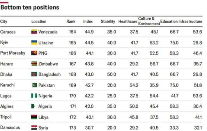 বসবাসের যোগ্য তালিকার শীর্ষ পাঁচ শহর হলো- ভিয়েনা, কোপেনহেগেন, জুরিখ, মেলবোর্ন ও ক্যালগারি। আর বসবাসের অযোগ্য পাঁচ শহর হলো- দামেস্ক, ত্রিপোলি, আলজিয়ার্স, লাগোস ও করাচি।