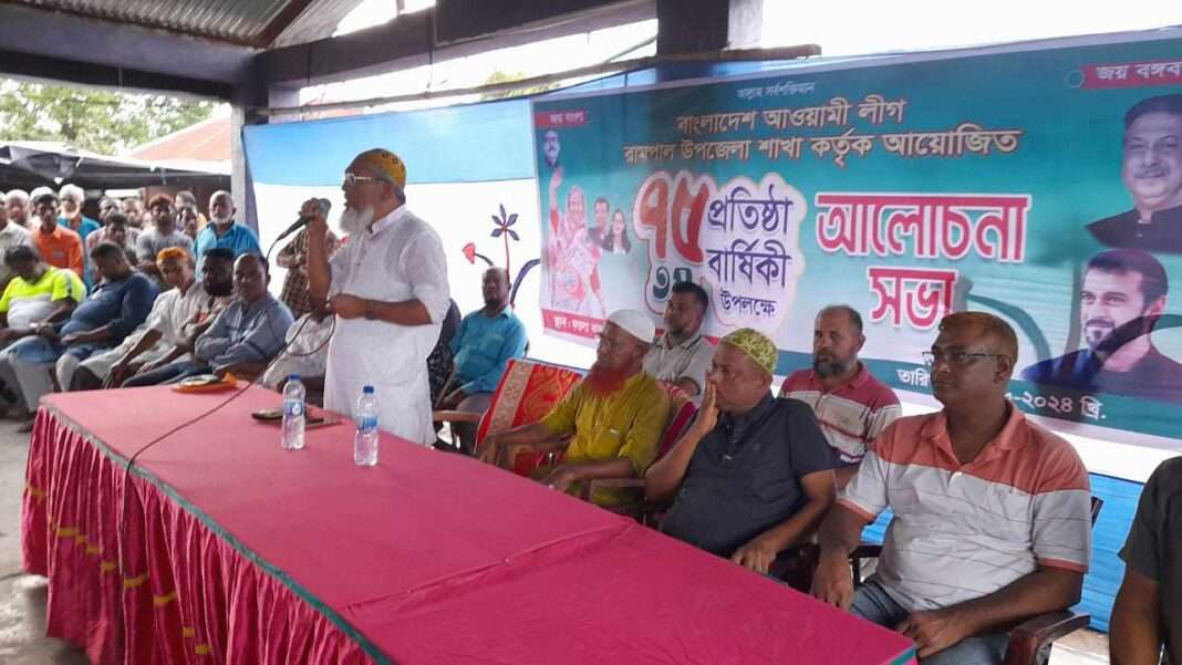 বাগেরহাটের রামপালে আওয়ামীলীগের ৭৫ তম প্রতিষ্ঠা বার্ষিকী পালন করা হয়েছে। শনিবার (২৯ জুন) বিকাল ৪ টায় উপজেলার ফয়লাহাটের বাজার চাদিতে উজলকুড় ইউপি চেয়ারম্যান মুন্সী বোরহান উদ্দিন জেডে’র সভাপতিত্বে অনুষ্ঠিত আলোচনা সভায় প্রধান অতিথির বক্তব্য দেন সাবেক উপজেলা চেয়ারম্যান শেখ মো. আবু সাইদ।
