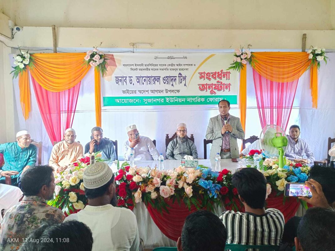 মৌলভীবাজারের বড়লেখায় বাংলাদেশ ইসলামী ছাত্রশিবিরের সাবেক কেন্দ্রীয় আইন সম্পাদক ও সাবেক সিলেট মহানগরীর সভাপতি ড.আনোয়ারুল ওয়াদুদ টিপু ফিলিপাইন থেকে স্বদেশ আগমন উপলক্ষে সংবর্ধনা অনুষ্ঠান অনুষ্ঠিত হয়েছে। রবিবার (১১ আগষ্ট) ইউনিয়ন অডিটোরিয়ামে সুজানগর ইউনিয়ন নাগরিক ফোরামের আয়োজনে সংগঠনের ইউনিয়ন সেক্রেটারি আব্দুল কুদ্দুস মারজানের সঞ্চাললায় ও ইউনিয়ন সভাপতি মাষ্টার সরফ উদ্দিনের সভাপতিত্বে শুভেচ্ছা বক্তব্য রাখেন উপজেলা শ্রমিক কল্যাণ ফেডারেশনের সেক্রেটারি দেলোয়ার হোসেন সাঈদ, প্রধান অতিথির রাখেন মৌলভীবাজার-১ (বড়লেখা-জুড়ি) আসনের সংসদ পদপ্রার্থী মাওলানা আমিনুল ইসলাম।
