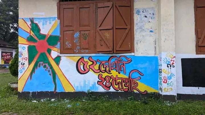 যে দেয়ালে ছিল বিভিন্ন পণ্যের বাহারি বিজ্ঞাপনের পসরা। তার পরিবর্তে আজ সেখানে বৈষম্য বিরোধী আন্দোলনের শিক্ষার্থীদের রঙ তুলির ছোঁয়ায় ফুটে তুলেছে কোটা আন্দোলনের শ্লোগানসহ দেশের বিভিন্ন চিত্র আর সমাজ সংস্কারমূলক উক্তি।