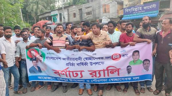 রাজশাহীর দুর্গাপুরে বাংলাদেশ জাতীয়তাবাদী স্বেচ্ছাসেবক দলের ৪৪তম প্রতিষ্ঠাবার্ষিকী উপলক্ষে বর্ণাঢ্য র্যালি ও পথ সভা অনুষ্ঠিত হয়েছে। মঙ্গলবার (২০ আগস্ট) বিকেলে উপজেলা ও পৌর স্বেচ্ছাসেবক দলের আয়োজনে বর্ণাঢ্য র্যালি ও পথ সভা অনুষ্ঠিত হয়। র্যালিটি উপজেলার সিংগা হাট মাঠ থেকে বিভিন্ন সড়ক প্রদক্ষিণ করে মেডিকেল মোড় চত্বরে গিয়ে শেষ হয়। পরে মেডিকেল মোড়ে সংক্ষিপ্ত পথসভা অনুষ্ঠিত হয়।