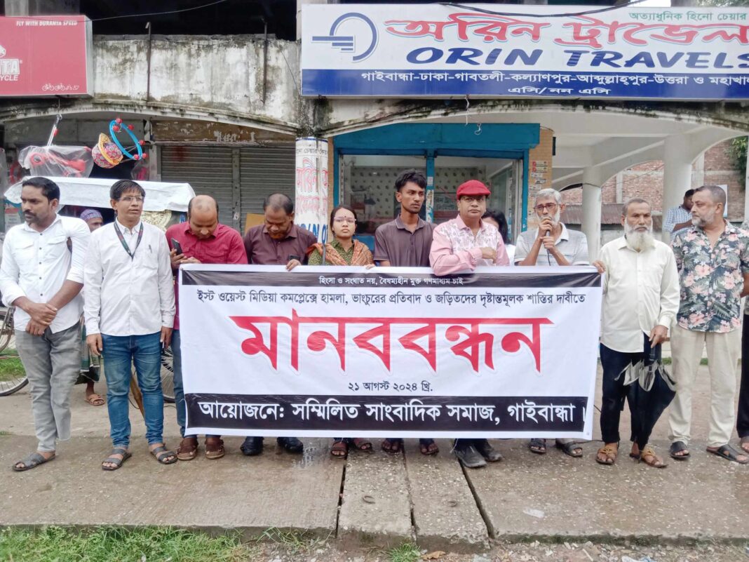 দেশের শীর্ষস্থানীয় গণমাধ্যম প্রতিষ্ঠান ইস্ট-ওয়েস্ট মিডিয়া কমপ্লেক্সে হামলা, ভাংচুরের প্রতিবাদ ও জড়িতদের দৃষ্টান্তমূলক শাস্তির দাবিতে মানববন্ধন কর্মসূচি পালন করেছেন গাইবান্ধায় কর্মরত সাংবাদিকরা। মঙ্গলবার (২১ আগস্ট) দুপুরে শহরের গানাসাস মার্কেটের সামনে সম্মিলিত সাংবাদিক সমাজ গাইবান্ধার ব্যানারে প্রতিবাদী এ কর্মসূচি আয়োজন করা হয়। মানববন্ধনে বক্তারা ইস্ট-ওয়েস্ট মিডিয়া কমপ্লেক্সে হামলা ও ভাংচুরের ঘটনায় নিন্দা জানান। সেই সাথে জড়িতদের চিহ্নিত করে আইনের আওতায় আনার দাবি জানানো হয়।