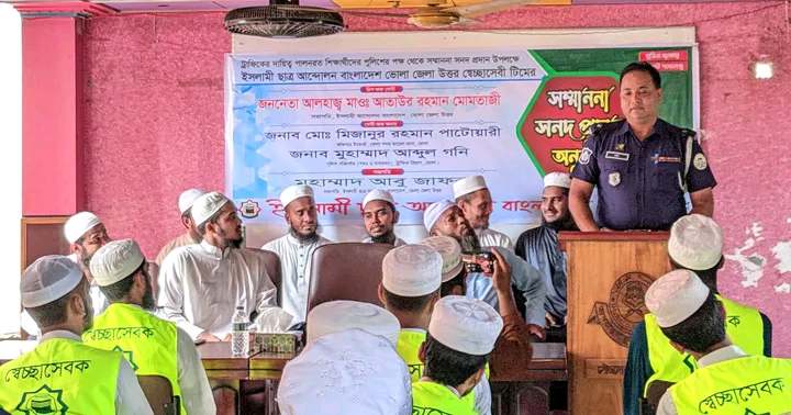 ০৫ সেপ্টেম্বর ২০২৪ বৃহস্পতিবার সকাল ৯ঘটিকার সময় ভোলা সদর উপজেলার জিএসপি রেস্টুরেন্টে গত ৬ আগস্ট ২০২৪ ইং তারিখ থেকে ট্রাফিকের দায়িত্ব পালনরত শিক্ষার্থীদের পুলিশের পক্ষ থেকে সম্মাননা সনদ প্রদান উপলক্ষে ইসলামী ছাত্র আন্দোলন বাংলাদেশ,ভোলা জেলা উত্তর শাখার স্বেচ্ছাসেবী টিমের সম্মাননা সনদ প্রদান অনুষ্ঠান অনুষ্ঠিত হয়েছে।
