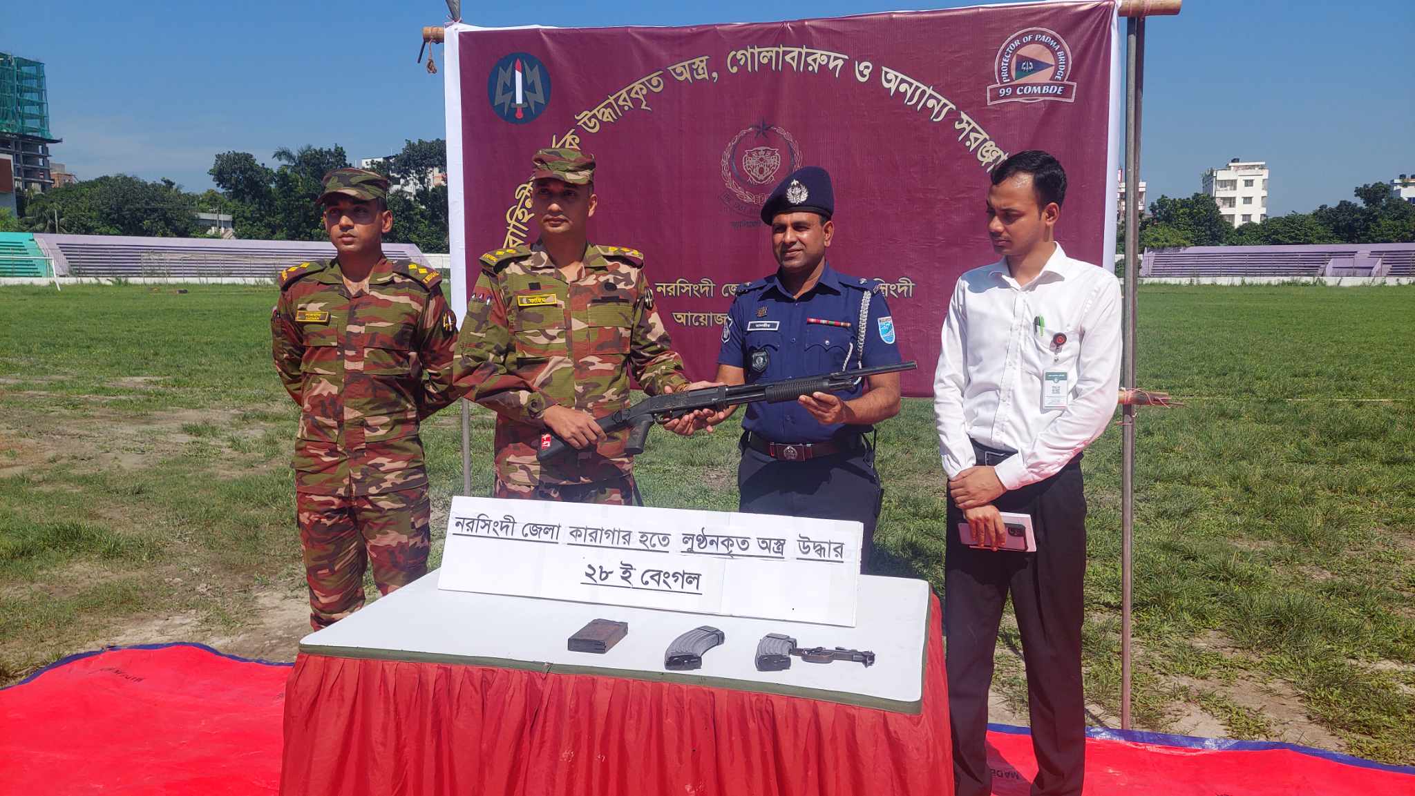 এসময় লে. কর্ণেল মোহাম্মদ ফাহিম মাহবুব সাংবাদিকদের জানান, পলাশ উপজেলার ঘোড়াশাল টেঙ্গরপাড়া এলাকার একটি ঘন জঙ্গলে আগ্নেয়াস্ত্র রয়েছে এমন গোপন তথ্যের ভিত্তিতে সেখানে অভিযান পরিচালনা করেন ক্যাপ্টেন মো: রকিবুল আলমের নেতৃত্বে সেনাবাহিনীর দুটি দল। এসময় পরিত্যক্ত অবস্থায় একটি শটগান উদ্ধার করা হয়। শটগানটি গত ১৯ জুলাই জেলা কারাগার হতে লুট হওয়া অস্ত্র হতে পারে বলে ধারনা করা হচ্ছে।
