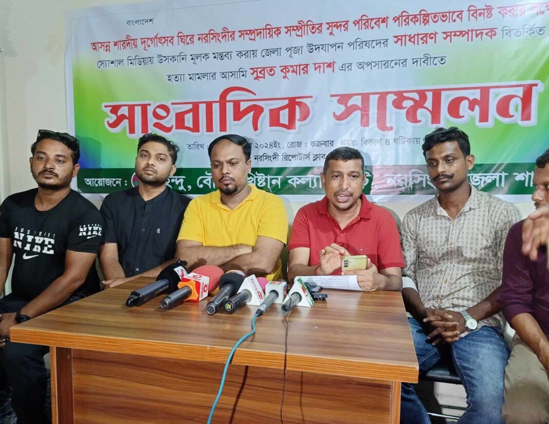 নরসিংদীতে জেলা পূজা উৎযাপন কমিটির সাধারণ সম্পাদক সুব্রত কুমার সাহার ফেসবুক পোস্টে সাম্প্রদায়িক উস্কানিমূলক লেখার প্রতিবাদে নরসিংদী রিপোর্টার্স ক্লাবের হল রুমে সাংবাদিক সম্মেলনের আয়োজন করেছে হিন্দু খ্রিস্টান বৌদ্ধ কল্যাণ ট্রাস্ট। এসময় উপস্থিত সাংবাদিকদের উদ্দেশ্যে তারা বলেন ‘আমরা বাংলাদেশী হিন্দু- মুসলিম হাজার বছরের সম্প্রীতির ঐতিহ্য লালন করে আসছি।