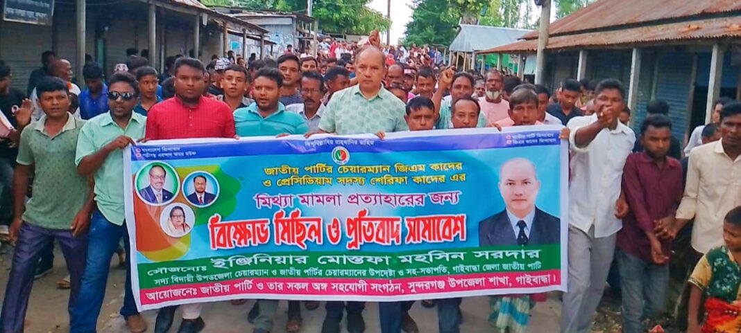 জাতীয় পার্টির চেয়ারম্যান জি এম কাদের ও তার সহধর্মিনী জাতীয় পার্টির প্রেসিডিয়াম সদস্য শেরীফা কাদেরের বিরুদ্ধে ষড়যন্ত্রমূলকভাবে মিথ্যা মামলায় অন্তর্ভুক্তির প্রতিবাদে গাইবান্ধার সুন্দরগঞ্জ উপজেলায় বিক্ষোভ মিছিল করেছে জাতীয় পার্টির নেতাকর্মীরা।