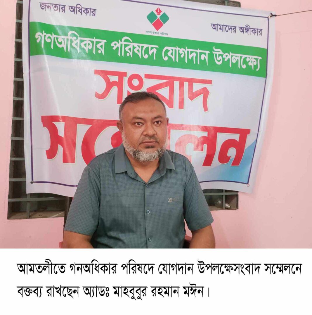 সোমবার দুপুর ১ টায় আমতলী পল্লী বিদ্যুত অফিস সলগ্ন গনঅধিকার পরিষদ আমতলী উপজেলা শাখার অস্থায়ী কার্যালয়ে এ সংবাদ সম্মেলন অনুষ্ঠিত হয়। সংবাদ সম্মেলনে অ্যাডঃ মাহবুবুর রহমান মঈন বলেন, গনঅধিকার পরিষদ প্রতিষ্ঠালগ্ন থেকে আমি এ দলের কার্যক্রম চালিয়ে যাচ্ছি।