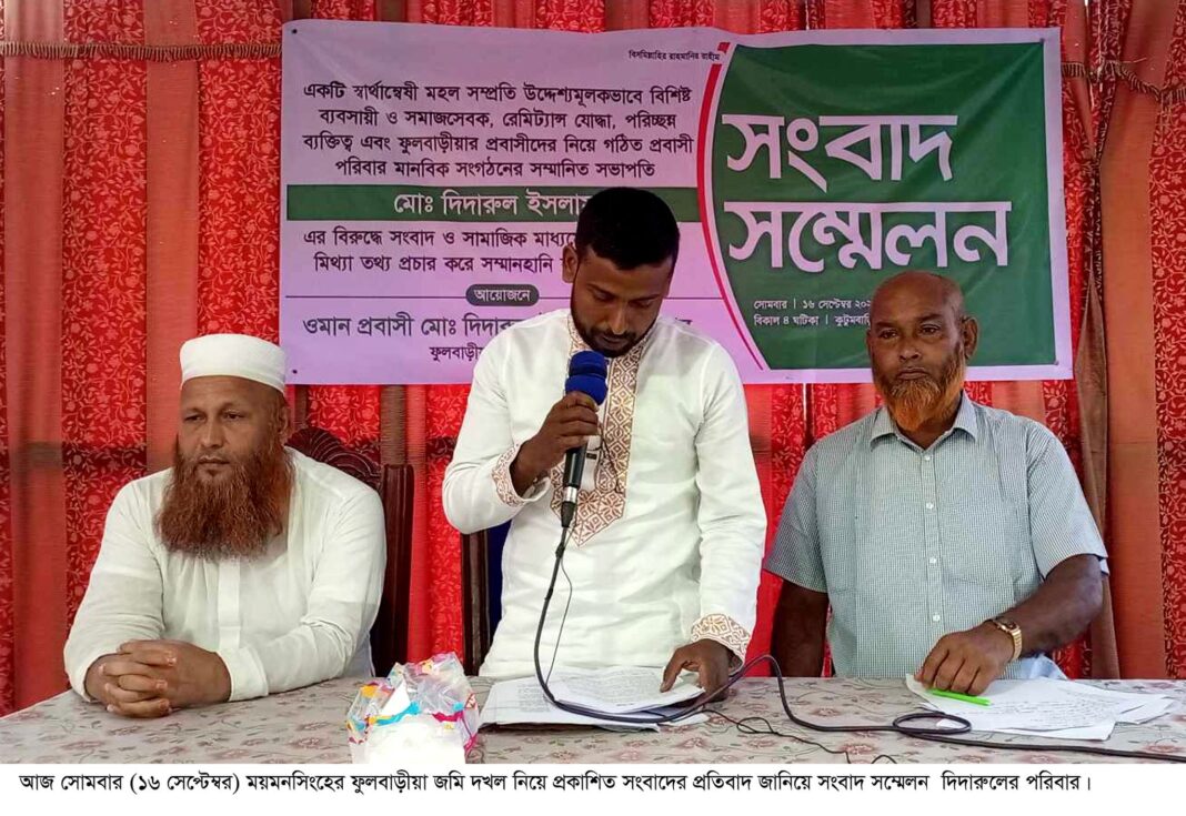 ময়মনসিংহের ফুলবাড়ীয়া পৌরসভার ০৩ নং ওয়ার্ড পুরাতন গরুহাটা সাড়ে ৮ শতাংশ জমি দখল করে নেয়ার অভিযোগে ওমান প্রবাসী দিদারুল ইসলামের বিরুদ্ধে বেশ কয়েকটি গণমাধ্যেমে সংবাদ প্রকাশিত। এরই প্রতিবাদ জানিয়ে সোমবার (১৬ সেপ্টেম্বর) বিকেলে ফুলবাড়ীয়া শহরের কুটুমবাড়ী কনভেনশন সেন্টারের সংবাদ সম্মেলন করেছেন ওমান প্রবাসী দিদারুল ইসলামের পরিবার ।