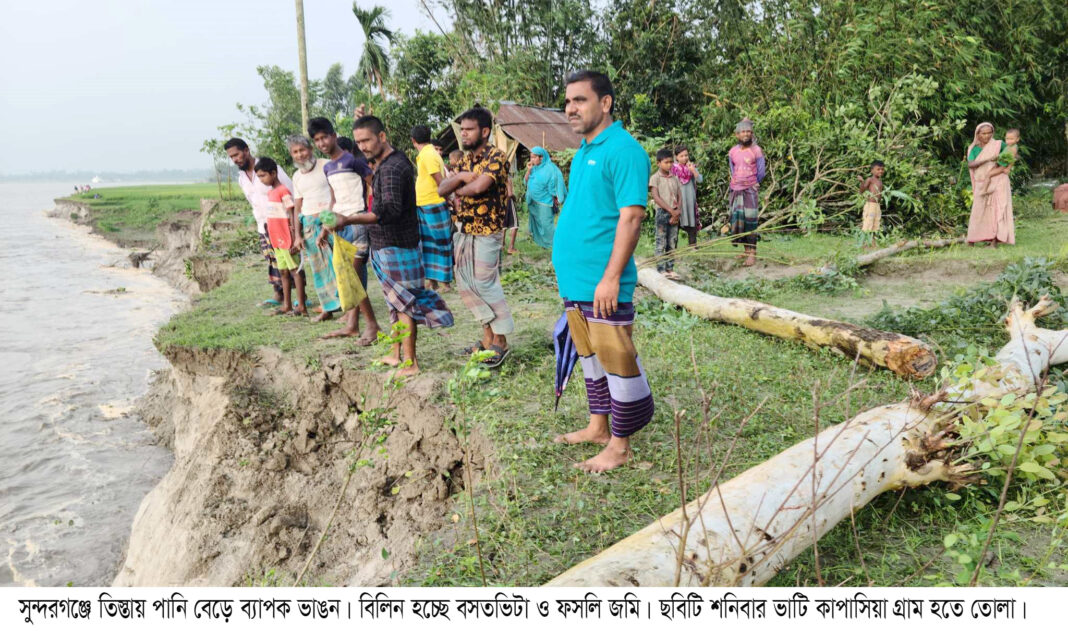 ভারী বর্ষণ এবং উজান থেকে আসা ঢলে পানি বেড়ে সুন্দরগঞ্জের তিস্তা নদীতে ব্যাপক ভাঙন শুরু হয়েছে। অব্যাহত ভাঙনে উঠতি আমন ক্ষেতসহ বিভিন্ন ফসলি জমি ও বসতভিটা নদীতে বিলিন হচ্ছে। গত দুই মাসে উপজেলা কাপাসিয়া, হরিপর, শ্রীপুর ও চন্ডিপুর ইউনিয়নে পাঁচ শতাধিক বিঘা ফসলি জমি ও অন্তত শতাধিক বসতবাড়ি তিস্তায় বিলিন হয়েছে।