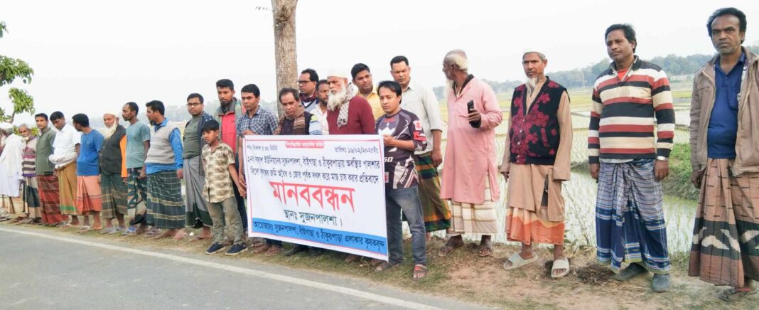 মানববন্ধনে উপস্থিত কৃষকদের দাবি তাদের পৈত্রিক সম্পত্তি গত প্রায় ১২ বছর ধরে শুধুমাত্র ধান চাষের বিনিময়ে অলিখিতভাবে একটি মহল ভোগদখল করে আসছে।এখন আমরা এর প্রতিকার চাই। মানববন্ধনে উপস্থিত থেকে বক্তব্য প্রদান করেন, অত্র সুজনপালশা গ্রামের কৃষক মোঃ বাবু, মোঃ আবুল ওয়াহেদ, মনজুরুল ইসলাম শান্ত সহ অন্যান্য কৃষকগণ।