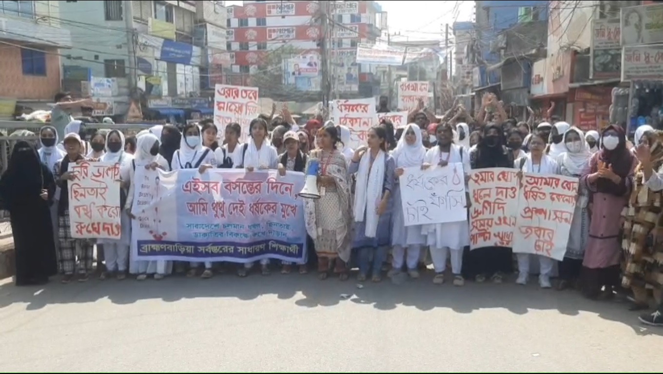 সারাদেশে চলমান ধর্ষণ, ছিনতাই ও ডাকাতিসহ আইনশৃঙ্খলা পরিস্থিতির অবনতির প্রতিবাদে ব্রাহ্মণবাড়িয়ায় বিক্ষোভ মিছিল ও মানববন্ধন হয়েছে। আজ মঙ্গলবার জেলার সর্বস্তরের সাধারণ শিক্ষার্থীদের উদ্যোগে এই বিক্ষোভ কর্মসূচী পালন করা হয়। ব্রাহ্মণবাড়িয়া সরকারি কলেজের সামনে থেকে একটি বিক্ষোভ মিছিল বের হয়ে শহরের প্রধান প্রধান সড়ক প্রদক্ষিণ করে ব্রাহ্মণবাড়িয়া প্রেসক্লাবের সামনে গিয়ে শেষ হয়। পরে সেখানে মানববন্ধন করে তারা।
