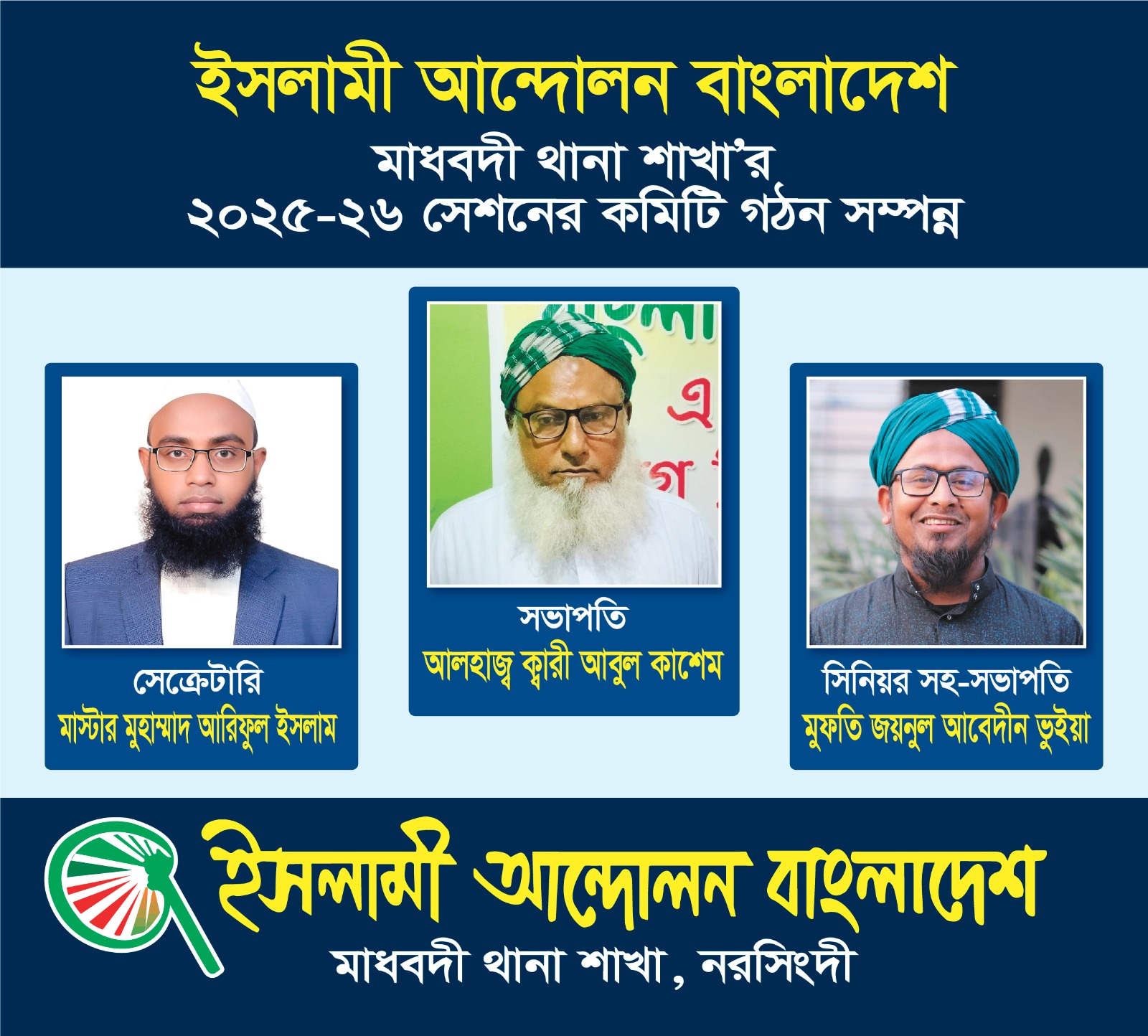 ইসলামী আন্দোলন বাংলাদেশ মাধবদী থানা শাখার নতুন কমিটি গঠন করা হয়েছে। নতুন কমিটিতে সভাপতি আলহাজ্ব ক্বারী আবুল কাশেম, সিনিয়র সহ-সভাপতি মুফতি জয়নুল আবেদীন ভুইয়া, সহ-সভাপতি আব্দুল আওয়াল মুন্সি, সহ সভাপতি মাওলানা রুহুল আমীন, সেক্রেটারি মাস্টার মুহাম্মাদ আরিফুল ইসলাম, জয়েন্ট সেক্রেটারি আমজাদ হোসেন, এসিস্ট্যান্ট সেক্রেটারি মুফতি আরিফ মাহমুদ ও সাংগঠনিক সম্পাদক মাস্টার আব্দুল মোমেনের নাম ঘোষনা করা হয়েছে।