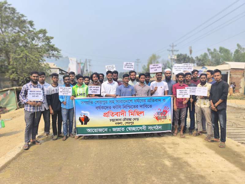 দেশব্যাপী ধর্ষণ ও নারী নির্যাতনের ঘটনার সুষ্ঠু তদন্ত ও ধর্ষকদের সর্বোচ্চ শাস্তির দাবিতে শেরপুরের নকলা উপজেলার চন্দ্রকোনায় এক বিশাল প্রতিবাদী মিছিল অনুষ্ঠিত হয়েছে।