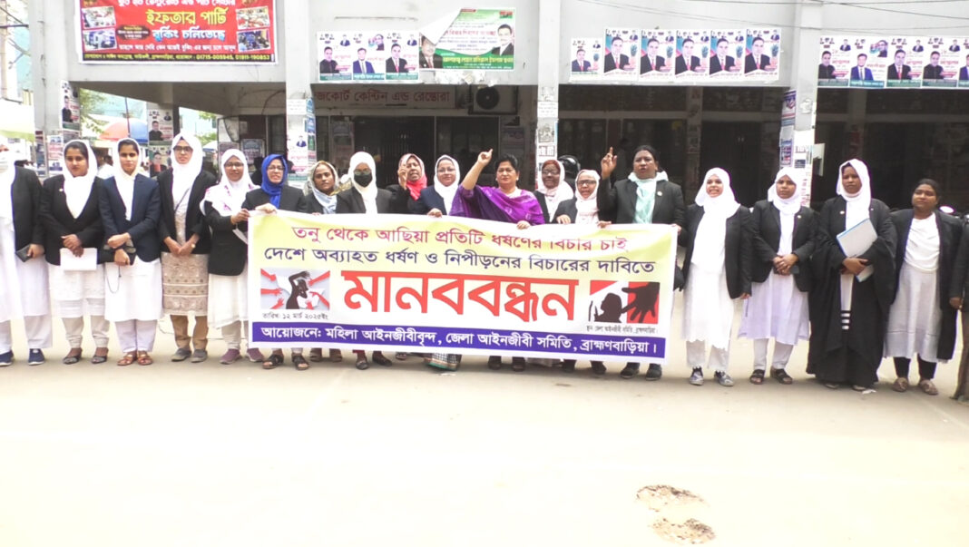 তনু থেকে আছিয়া প্রতিটি ধর্ষণের বিচারসহ দেশে অব্যাহত ধর্ষণ এবং নিপীড়নের বিচারের দাবিতে মানববন্ধন ও বিক্ষোভ মিছিল অনুষ্ঠিত হয়েছে। বুধবার দুপুরে ব্রাহ্মণবাড়িয়া জেলা আইনজীবি সমিতি ভবনের সামনে মহিলা আইনজীবী উদ্যোগে এ মনববন্ধন করা হয়েছে।