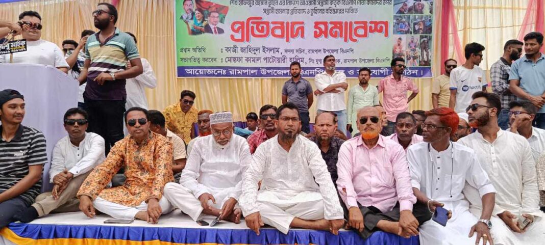 বাগেরহাটের রামপালে শেখ হাফিজুর রহমান তুহিনের নির্দেশে আওয়ামী সন্ত্রাসী হামলার প্রতিবাদে ও তুহিনের বহিষ্কারের দাবীতে এক প্রতিবাদ সমাবেশ অনুষ্ঠিত হয়েছে। বৃহস্পতিবার (১৩ মার্চ) বেলা ১১ টায় উপজেলার ফয়লাহাট বাসস্টান্ডে বিক্ষোভ মিছিল শেষে উপজেলা বিএনপির সিনিয়র যুগ্ম আহবায়ক মোস্তফা কামাল পাটোয়ারীর সভাপতিত্ব এ সভা অনুষ্ঠিত হয়।