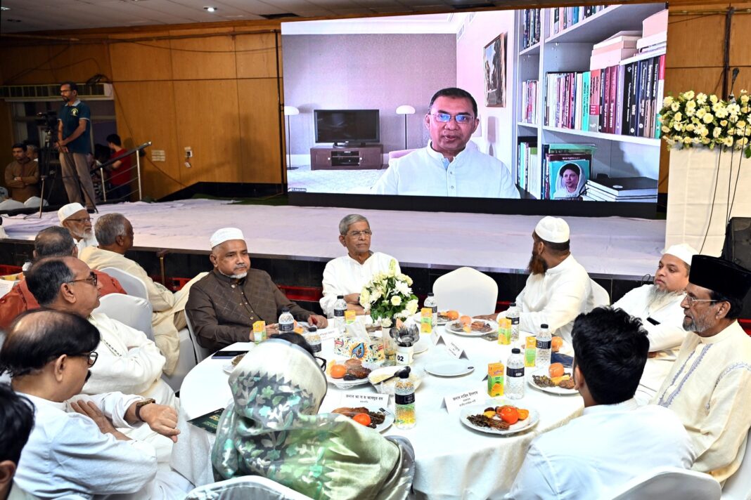 বুধবার (১৯ মার্চ) রাজনৈতিক নেতৃবৃন্দের সম্মানে রাজধানীর ঢাকা লেডিস ক্লাবে বিএনপির আয়োজিত এক ইফতার মাহফিলে ভার্চুয়ালি যুক্ত হয়ে তারেক রহমান বলেন, দেশের অসাম্প্রদায়িক গণতান্ত্রিক চরিত্র সমুন্নত রাখতে চরমপন্থা ও ধর্মীয় উগ্রবাদী অপশক্তি প্রতিহত করার পাশাপাশি গণহত্যাকারী পলাতক মাফিয়া চক্রকে যেকোন মূল্যে বিচারের সম্মুখীন করার মাধ্যমে বাংলাদেশে গণতান্ত্রিক ব্যবস্থা শক্তিশালী করাই হবে বিএনপিসহ গণতন্ত্রের পক্ষের শক্তির আগামী দিনের রাজনৈতিক বন্দোবস্ত।
