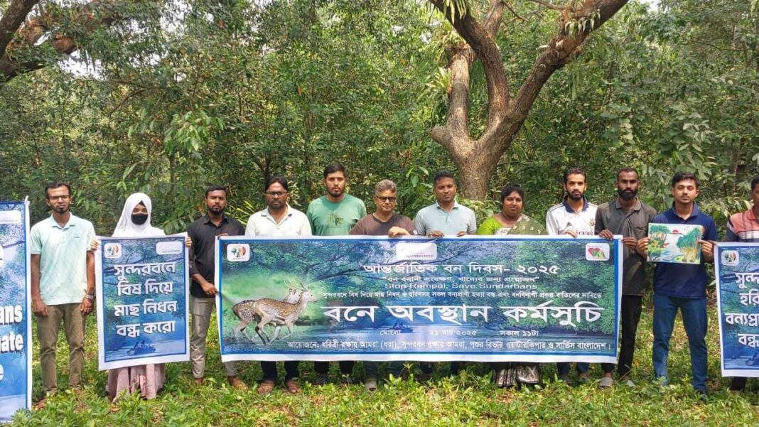 ২১ মার্চ শুক্রবার সকালে আন্তর্জাতিক বন দিবস উপলক্ষে মোংলা সরকারি কলেজের ম্যানগ্রোভ বনে সুন্দরবনে বিষ দিয়ে মাছ নিধন ও হরিণ শিকারসহ সকল বন্যপ্রাণী হত্যা বন্ধ এবং বনবিনাশী প্রকল্প বাতিলের দাবিতে অবস্থান কর্মসুচি পালিত হয়। ধরিত্রী রক্ষায় আমরা (ধরা), সুন্দরবন রক্ষায় আমরা, পশুর রিভার ওয়াটারকিপার ও সার্ভিস বাংলাদেশ’র আয়োজনে এ অবস্থান কর্মসুচি পালিত হয়। শুক্রবার সকাল ১১টায় বনে অবস্থান কর্মসুচিতে সভাপতিত্ব করেন সুন্দরবন রক্ষায় আমরা’র সমন্বয়কারী পশুর রিভার ওয়াটারকিপার মোঃ নূর আলম শেখ।