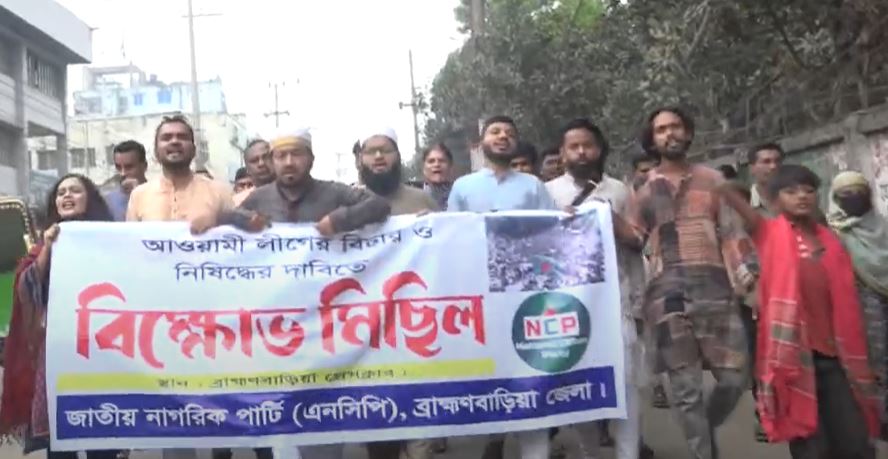 আ.লীগের বিচার ও নিষিদ্ধের দাবিতে বিক্ষোভ মিছিল ও প্রতিবাদ করেছে জাতীয় নাগরিক পার্টি (এনসিপি) ব্রাহ্মণবাড়িয়া জেলা শাখা। শনিবার বিকেলে শহরের পৌর মুক্ত মঞ্চ থেকে একটি বিক্ষোভ মিছিল বের হয়ে প্রেসক্লাবের সামনে এসে শেষ হয়। পরে সেখানে একটি প্রতিবাদ সমাবেশ অনুষ্টিত হয়। সুহিলপুর ইউনিয়নের সাবেক চেয়ারম্যান আজিজুল রহমান লিটনের সভাপতিত্বে বক্তব্য রাখেন, জাতীয় নাগরিক পার্টির যুগ্ম আহবায়ক আশরাফ উদ্দিন মাহদি, যুগ্ম মূখ্য সংগঠক মো: আতাউল্লাহ, সংগঠক আব্দুল্লাহ আল মাহমুদ জিহান।