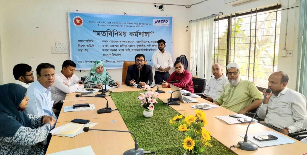 বাগেরহাটের রামপালে উপজেলা সমন্বিত পানি সম্পদ ব্যাবস্থাপনা কমিটির এক মত বিনিময় কর্মশালা অনুষ্ঠিত হয়েছে। সোমবার (২৪ মার্চ) বেলা ১১ টায় উপজেলা পরিষদের সম্মেলন কক্ষে উপজেলা নির্বাহী কর্মকর্তা মারুফা বেগম নেলী’র সভাপতিত্বে অনুষ্ঠিত কর্মশালায় প্রধান অতিথির বক্তব্য দেন, পানি সম্পদ মন্ত্রণালয়ের যুগ্ম সচিব মো. হাবিবুর রহমান, পানি সম্পাদ পরিকল্পনা সংস্থার মুখ্য বৈজ্ঞানিক কর্মকর্তা মো. হাসান শাহরিয়ার, মো. মাহাফুজুর রহমান, উপজেলা সহকারী কমিশনার (ভূমি) মো. আফতাব আহমেদ, প্রভাষক মো.তাহিদুল ইসলাম, প্রেসক্লাব রামপালের সভাপতি ও বাংলাদেশ পরিবেশ আইনবিদ সমিতি (বেলা)’র খুলনা বিভাগীয় নেটওয়ার্ক সদস্য এম, এ সবুর রানা, পরিবেশবিদ ও ইয়োথ ফোরামের কর্মকর্তা মাহাফুজ মাঝি প্রমুখ।