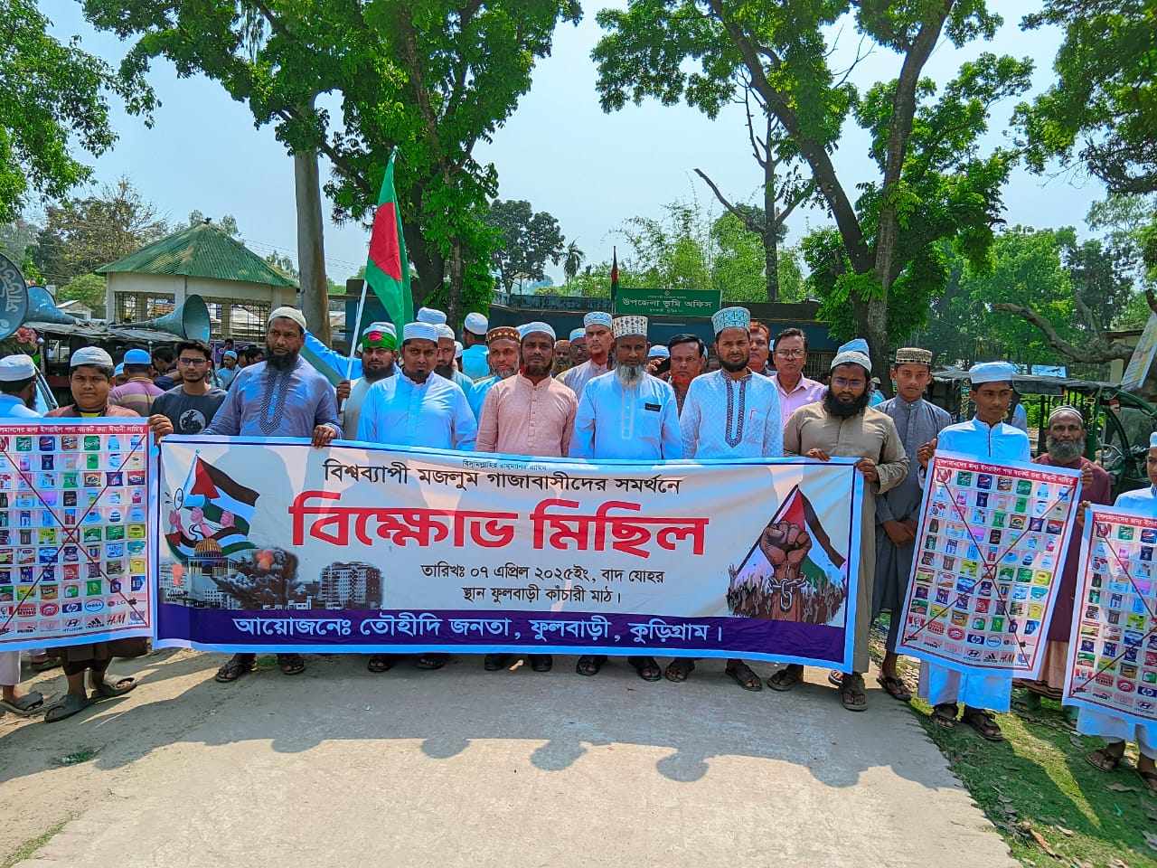 সোমবার (৭ এপ্রিল) বাদ জোহর ফুলবাড়ী কাচারি মাঠ হইতে বিশ্বব্যাপী মজলুম গাজারবাসীদের সমর্থনে তৌহিদী জনতার ব্যানারে তৌহিদী জনতা ফুলবাড়ী শাখার আয়োজনে দলবল নির্বিশেষে মুসলমানদের উপর অন্যায় অত্যাচার ও হত্যার প্রতিবাদে এক বিশাল বিক্ষোভ মিছিল বের হয়ে উপজেলার প্রধান প্রধান সড়কগুলো প্রদক্ষিণ করে তিন কনা মোড় জিরো পয়েন্টে এসে প্রতিবাদ সমাবেশ অনুষ্ঠিত হয়।এ বিক্ষোভ ও প্রতিবাদ সমাবেশে উপজেলার সর্বস্তরের জনগণ শিক্ষার্থীসহ নানা শ্রেণী পেশার মানুষ অংশগ্রহণ করেন।