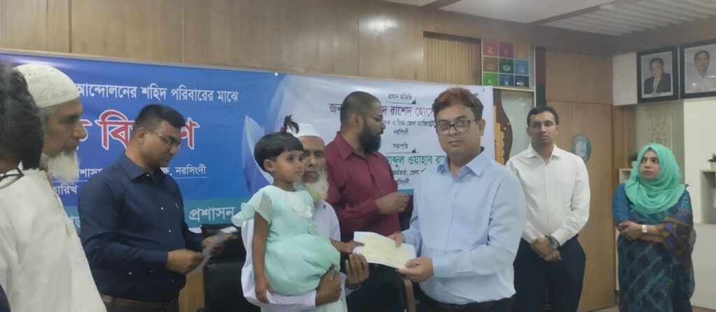 বৈষম্য বিরোধী আন্দোলনে নিহত পরিবারের মাঝে চেক বিতরণ করা হয়েছে নরসিংদীতে।