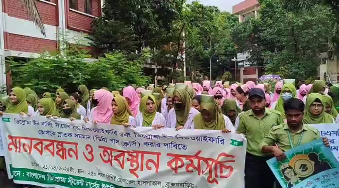 ব্রাহ্মণবাড়িয়ায় বাংলাদেশ ডিপ্লোমা স্টুডেন্ট নার্সেস ইউনিয়ন জেলা শাখার আহবানে ডিপ্লোমা ইন নার্সিং সায়েন্স এন্ড মিডোয়াইফারি এবং ডিপ্লোমা ইন মিডওয়াইফারি কোর্সকে স্নাতক সমমান (ডিগ্রি পাস কোর্স) করার দাবিতে মানববন্ধন ও অবস্থান কর্মসূচী অনুষ্ঠিত হয়েছে।