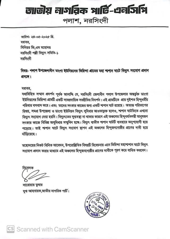 ২৪ এপ্রিল বৃহস্পতিবার সনাতন ধর্মাবলম্বীদের সৎকারসহ এই সংশ্লিষ্ট কাজের অগ্রগতির স্বার্থে গ্রামবাসীর পক্ষে শ্মশানটিতে বিদ্যুত সংযোগের আবেদন করেন জাতীয় নাগরিক পার্টি-এনসিপি, পলাশ উপজেলা।