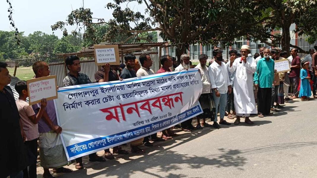 রাজশাহীর বাগমারায় অবসর প্রাপ্ত মাদ্রাসার অধ্যক্ষের বিরুদ্ধে অবৈধ ভাবে মাদ্রাসার জমি জবর দখল ও অধ্যক্ষসহ শিক্ষকদের বিরুদ্ধে মিথ্যা মামলা দিয়ে হয়রানীর অভিযোগে মানববন্ধন করেছেন মাদ্রাসার শিক্ষক শিক্ষার্থীসহ এলাকার সচেতন ব্যক্তিরা।