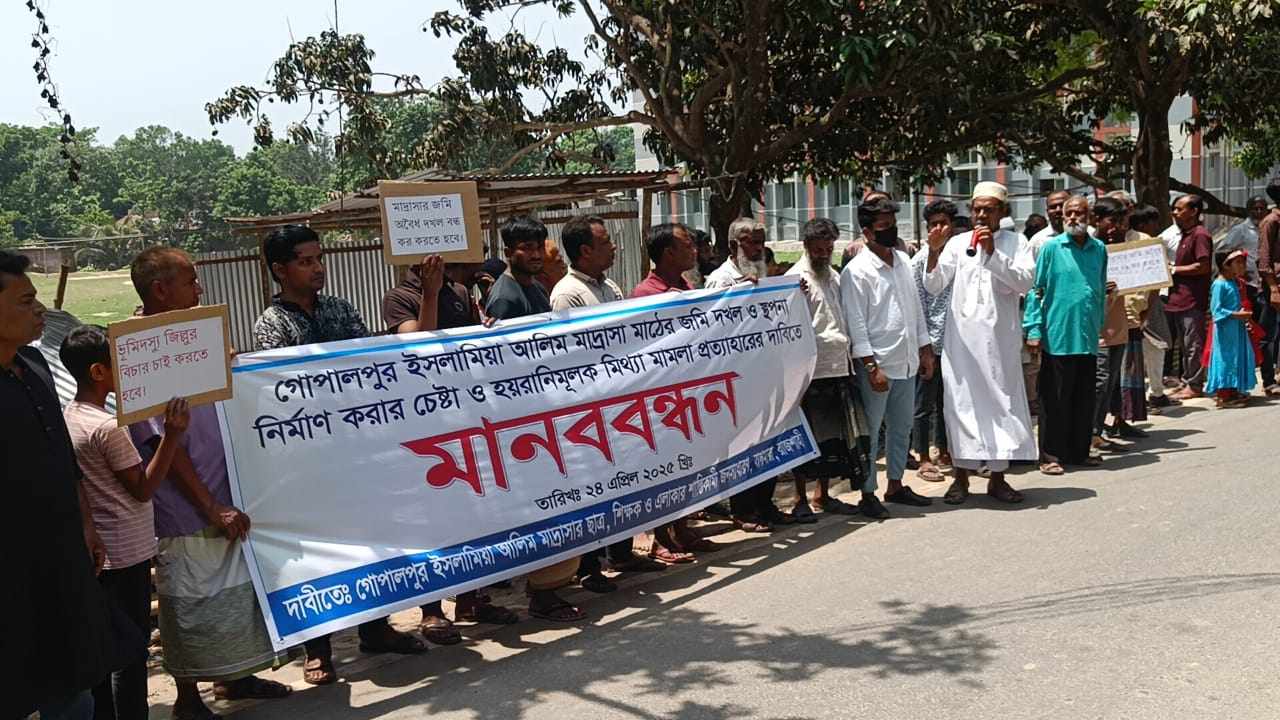 বৃহস্পতিবার (২৪ এপ্রিল) বেলা সাড়ে ১১টার দিকে গোপালপুর ইসলামিয়া আলিম মাদ্রাসার সামনে মানববন্ধনের আয়োজন করেন।তবে তার বিরুদ্ধে আনিত অভিযোগ অস্বীকার করেছেন অবসর প্রাপ্ত অধ্যক্ষ জিল্লুর রহমান।