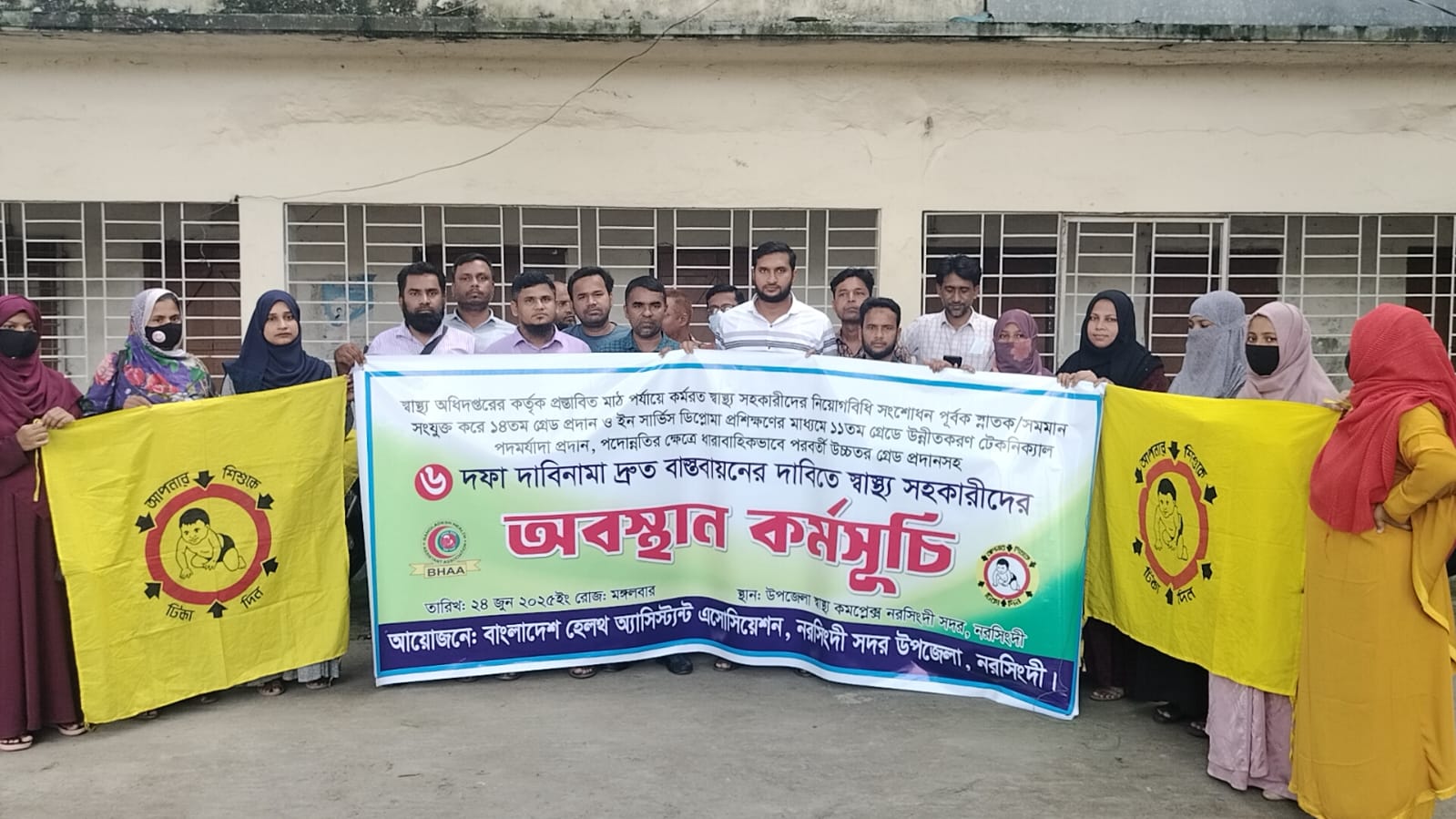 নরসিংদী, ২৪ জুন: স্বাস্থ্য অধিদপ্তরের প্রস্তাবিত নিয়োগবিধি সংশোধনসহ ৬ দফা দাবি বাস্তবায়নের দাবিতে অবস্থান কর্মসূচি পালন করেছে বাংলাদেশ হেলথ অ্যাসিস্ট্যান্ট অ্যাসোসিয়েশন, নরসিংদী সদর উপজেলা শাখা। কেন্দ্রীয় কর্মসূচির অংশ হিসেবে মঙ্গলবার সকালে নরসিংদী সদর উপজেলা স্বাস্থ্য কমপ্লেক্সে এই কর্মসূচি অনুষ্ঠিত হয়। এতে উপজেলার প্রায় সব ইউনিয়নের স্বাস্থ্য সহকারীরা অংশগ্রহণ করেন।