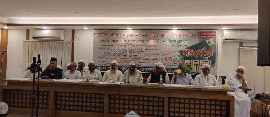 নরসিংদী প্রেসক্লাব মিলনায়তনে ২৩ জুন বিকাল হতে গভীর রাত পর্যন্ত সংবর্ধনা অনুষ্ঠানে নরসিংদী জেলা সভাপতি মুফতি মোশাররফ হোসেন রায়পুরীর সভাপতিত্বে উপস্থিত ছিলেন খেলাফত আন্দোলন কেন্দ্রীয় কমিটির সাংগঠনিক সম্পাদক সুলতান মহিউদ্দিন, যুগ্ম মহাসচিব রোকনুজ্জামান রোকন, নায়েবে আমির মাওলানা মুজিবুর রহমান হামিদি, নায়েবে আমির শায়খুল হাদিস শেখ আজীম উদ্দিন, প্রচার সম্পাদক মাওলানা সাইফুল ইসলাম সুনামগঞ্জী।