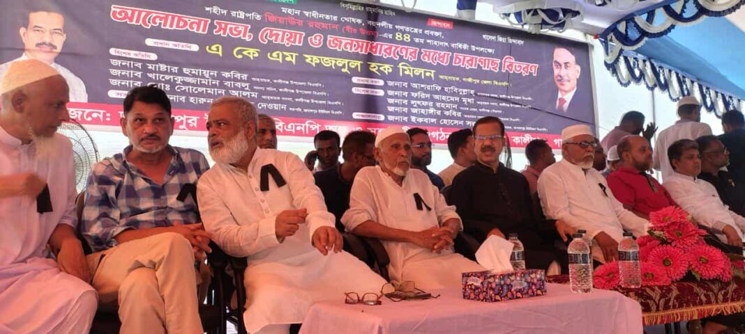 ইউনিয়ন বিএনপির সাবেক সভাপতি হারুন-অর-রশীদ দেওয়ান এর সভাপতিত্বে এবং সাবেক সাধারণ সম্পাদক ইকবাল হোসেন সরকার এর সঞ্চালনায় আয়োজিত সভায় প্রধান অতিথি হিসেবে উপস্থিত হয়ে জনসাধারণের মাঝে বিভিন্ন প্রজাতির চারা গাছ বিতরণ করেন বিএনপি’র কেন্দ্রীয় কমিটির সাবেক সাংগঠনিক সম্পাদক, গাজীপুর জেলা বিএনপি’র সাবেক সভাপতি, গাজীপুর-৫ আসনের সাবেক সংসদ সদস্য ও গাজীপুর জেলা বিএনপি’র আহবায়ক আলহাজ্ব একে এম ফজলুল হক মিলন। বৃহস্পতিবার (২৬ জুন) বিকেল ৪ ঘঠিকার সময় উপজেলার জামালপুর ইউনিয়ন বিএনপি ও সহযোগী সংগঠনের উদ্যোগে শহীদ রাষ্ট্রপতি জিয়াউর রহমান (বীর উত্তম) এর ৪৪তম শাহাদাৎ বার্ষিকী পালন উপলক্ষ্যে উপজেলার জামালপুর ইউনিয়নের ৯নং ওয়ার্ডের চান্দেরবাগ বাজার সংলগ্ন মাঠে বিশাল আলোচনা সভা ও জনসাধারণের মধ্য চারা গাছ বিতরণের আয়োজন করা হয়।