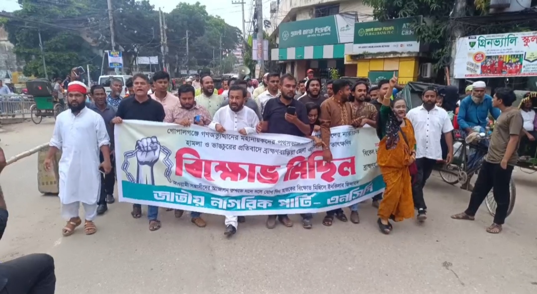 গোপালগঞ্জে এনসিপি নেতাকর্মীদের উপর হামলার ঘটনায় ব্রাহ্মণবাড়িয়ায় বিক্ষোভ মিছিল ও প্রতিবাদ সমাবেশ করেছে জাতীয় নাগরিক পার্টির নেতাকর্মীরা। বুধবার বিকেলে শহরের লোকনাথ টেংকের পাড় এলাকা থেকে একটি বিক্ষোভ মিছিল বের হয়ে কুমারশীল মোড়, সদর হাসপাতাল রোড, টি,এ,রোড, ফারুকী পার্ক সড়ক সহ প্রধান প্রধান সড়ক প্রদক্ষিণ করে কাউতলী মোড় এলাকায় কুমিল্লা- সিলেট মহাসড়কে অবস্থান নেয়। এ সময় অন্তত ১০ মিনিটের মত মহাসড়ক অবরোধ করে প্রতিবাদ সমাবেশ অনুষ্ঠিত হয়।
