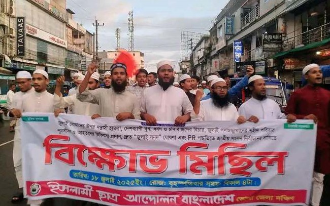 ১৮ জুলাই ২০২৫ শুক্রবার, বিকাল ৫.৩০ ঘটিকার সময় ইসলামী ছাত্র আন্দোলন বাংলাদেশ ভোলা জেলা দক্ষিণ শাখার উদ্যোগে ‘জুলাই জাগরণ ও স্বৈরাচার প্রতিরোধ দিবস’ উপলক্ষে জুলাই যোদ্ধাদের উপর সন্ত্রাসী হামলা, চলমান খুন, ধর্ষণ ও চাঁদাবাজদের বিচার, জুলাই গণঅভ্যুত্থানের শহীদ পরিবার পুনর্বাসন ও আহতদের চিকিৎসা প্রদান, দ্রুত ‘জুলাই সনদ’ ঘোষণা এবং পি আর পদ্ধতিতে জাতীয় সংসদ নির্বাচনের দাবিতে জেলা সভাপতি মোঃ আলী আজগর-এর সভাপতিত্বে বিক্ষোভ মিছিল অনুষ্ঠিত হয়।