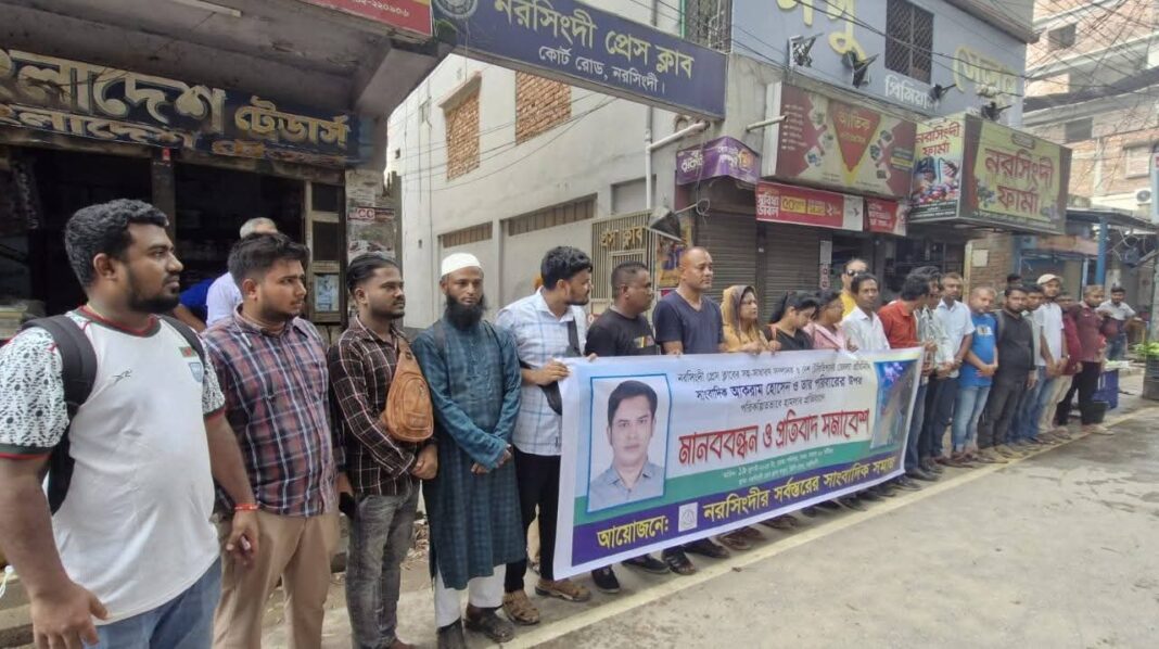 নরসিংদীতে দেশ টেলিভিশনের সাংবাদিক আকরাম হোসেন ও তার পরিবারের উপর হামলার প্রতিবাদে মানববন্ধন ও প্রতিবাদ সমাবেশ অনুষ্ঠিত হয়েছে। শনিবার (১৯ জুলাই) সকালে নরসিংদী প্রেস ক্লাবের সামনে জেলার সর্বস্তরের সাংবাদিক সমাজের ব্যানারে এ মানববন্ধন অনুষ্ঠিত হয়।