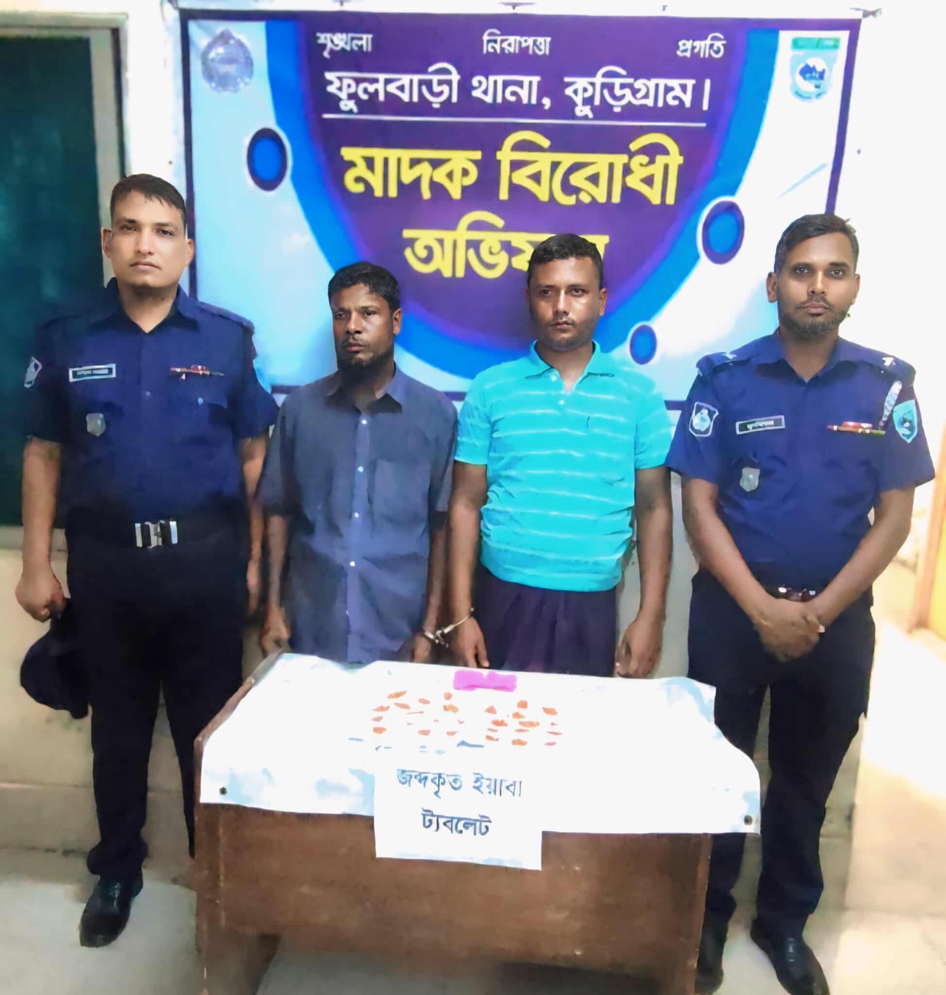 ফুলবাড়ীতে মাদকদ্রব্য ইয়াবা ট্যাবলেট সহ ২ জনকে গ্রেফতার করেছে ফুলবাড়ী থানা পুলিশ। বুধবার ২৩ জুলাই রাত সাড়েদশটার দিকে গোপন সংবাদের ভিত্তিতে কুড়িগ্রামের ফুলবাড়ী থানার অফিসার ইনচার্জ আব্দুস সালাম এর নেতৃত্বে থানার সঙ্গীও ফোর্স সহ অভিযান পরিচালনা করে আশরাফ আলীর বসতবাড়ি ঘরের ভিতর হতে প্লাস্টিকের জিপার ব্যাগে রক্ষিত ২৫১+২৫১ মোট ৫০২ পিস গোলাপী রঙ্গের ইয়াবা ট্যাবলেট সহ উপজেলার কুটিচন্দ্রখানা গ্রামের মৃত্যু হায়দার আলীর ছেলে আশরাফ আলী(৫০) সহ এর বসতবাড়িতে মাদকদ্রব্য ইয়াবা ট্যাবলেট ক্রয়, বিক্রয়ের সময় নজরুল ইসলামের ছেলে শহিদুল ইসলাম (৪২) কে গ্রেফতার করে।
