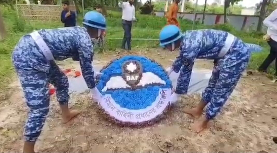 ঢাকার উত্তরায় মাইলস্টোন স্কুল অ্যান্ড কলেজে বিমান বাহিনীর প্রশিক্ষণ বিমান বিধ্বস্তের ঘটনায় নিহত শিক্ষিকা মাসুকা বেগমের কবরে পুষ্পস্তবক অর্পণ ও গার্ড অব অনার প্রদান করেছে বাংলাদেশ বিমান বাহিনী।