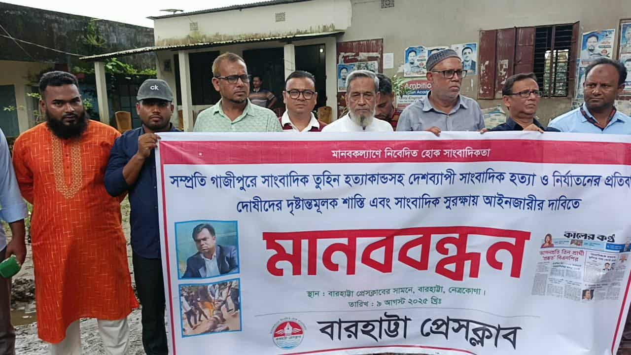 বক্তারা বলেন, তুহিন হত্যার বিচার যেন সাগর-রুনির হত্যার বিচারের মতো প্রহসনে পরিণত না হয়। তারা দ্রুত দোষীদের শনাক্ত করে দৃষ্টান্তমূলক শাস্তি নিশ্চিত করার আহ্বান জানান। এসময় বক্তারা সাংবাদিকদের সুরক্ষায় বিশেষ আইন প্রণয়নের দাবি জানান, যাতে সংবাদকর্মীরা নির্ভয়ে পেশাগত দায়িত্ব পালন করতে পারেন। মানববন্ধনে বারহাট্টা প্রেসক্লাবের সভাপতি, সম্পাদকসহ স্থানীয় জনপ্রতিনিধি, শিক্ষক, ব্যবসায়ী এবং সাধারণ মানুষ উপস্থিত ছিলেন।