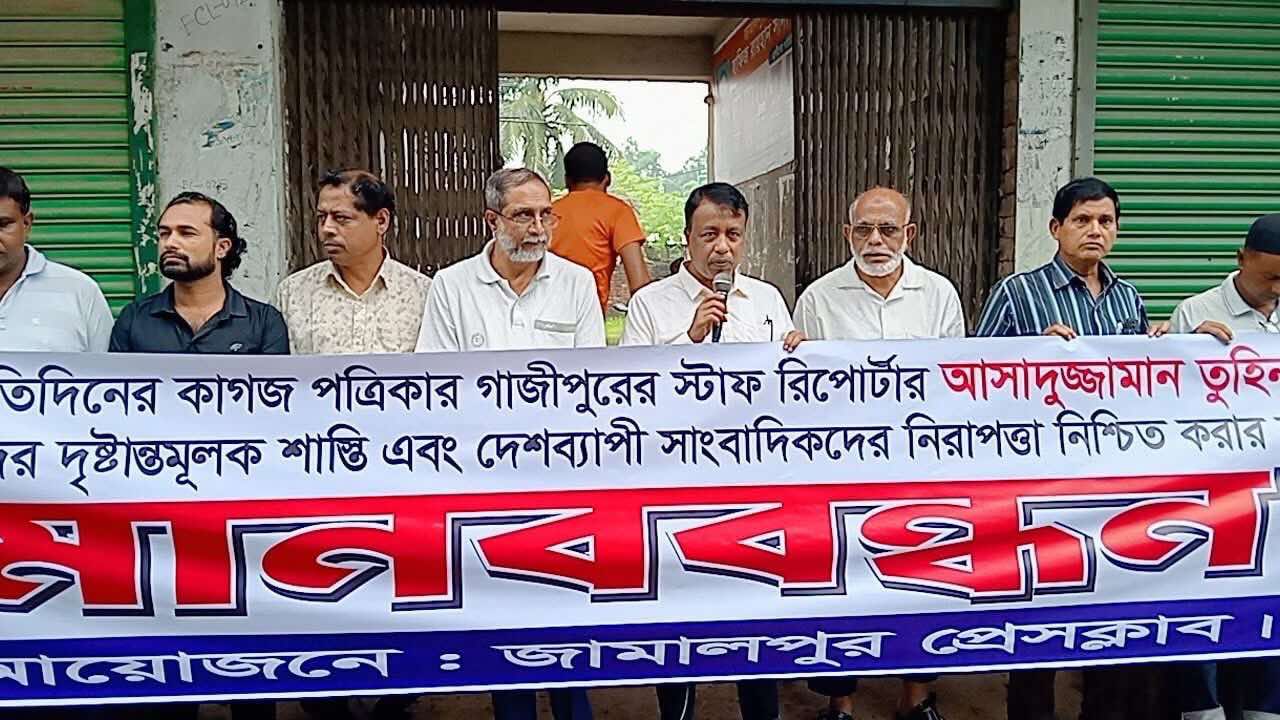 দৈনিক প্রতিদিনের কাগজ পত্রিকার গাজীপুরের স্টাফ রিপোর্টার আসাদুজ্জামান তুহিন হত্যাকারীদের দৃষ্টান্তমূলক শাস্তি এবং দেশব্যাপী সাংবাদিকদের নিরাপত্তা নিশ্চিত করার দাবিতে জামালপুরে মানববন্ধন অনুষ্ঠিত হয়েছে। দুর্যোগপূর্ণ আবহাওয়া উপেক্ষা করে জামালপুর প্রেস ক্লাবের আয়োজনে শনিবার দুপুর সাড়ে ১১ টায় প্রেসক্লাব রোডে ঘন্টাব্যাপী এই মানববন্ধন অনুষ্ঠিত হয়।