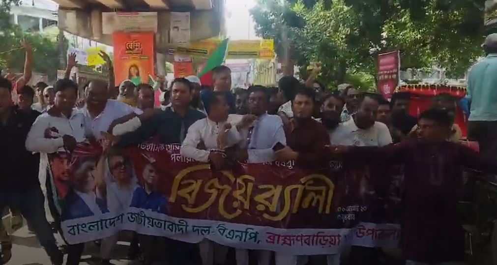 ছাত্র-জনতার বিজয়ের বর্ষপূর্তি উপলক্ষে ব্রাহ্মণবাড়িয়ায় বিজয় র‍্যালি ও মিছিল অনুষ্ঠিত হয়েছে। শনিবার বিকেলে সদর উপজেলা বিএনপির সাংগঠনিক সম্পাদক ও সাবেক জিএস সালাউদ্দিন আহমেদের নেতৃত্বে পৌরসভার সামনে থেকে মিছিলটি শুরু হয়।