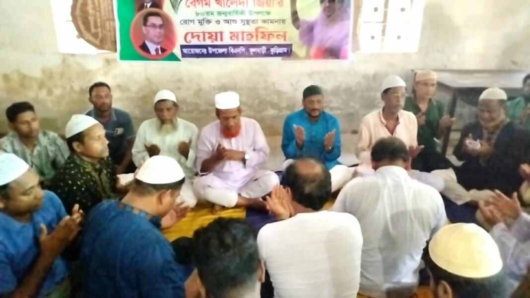 ফুলবাড়ীতে বেগম খালেদা জিয়া’র ৮০তম জন্মবার্ষিকী উপলক্ষে রোগ মুক্তি ও আশু সুস্থতা কামনায় দোয়া মাহফিল অনুষ্ঠিত হয়েছে। শুক্রবার ১৫ আগস্ট বিকেল ৪ টায় কুড়িগ্রামের ফুলবাড়ী উপজেলার পল্লী উন্নয়ন বোর্ড অফিসের সভা কক্ষে উপজেলা বিএনপি’র আয়োজনে বেগম খালেদা জিয়া’র ৮০তম জন্মবার্ষিকী উপলক্ষে রোগ মুক্তি ও আশু সুস্থতা কামনায় দোয়া মাহফিল অনুষ্ঠিত হয়েছে। এছাড়াও জেলা বিএনপির সদস্য ও উপজেলা বিএনপির সভাপতি নজির হোসেন ও উপজেলা বিএনপির সাধারণ সম্পাদক আব্দুল মান্নান মুকুল এর সুস্থতা কমনা করেন।