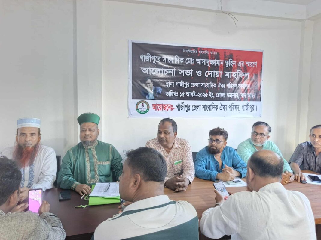 গাজীপুরে প্রকাশ্যে নৃশংসভাবে নিহত দৈনিক প্রতিদিনের কাগজের বিশেষ প্রতিনিধি সাংবাদিক আসাদুজ্জামান তুহিনের হত্যাকারীদের দ্রুত বিচার এবং তাঁর আত্মার মাগফেরাত কামনা করে দোয়া মাহফিল অনুষ্ঠিত হয়েছে। একই সঙ্গে দেশব্যাপী সন্ত্রাসী হামলায় নিহত সাংবাদিক ও আহত সাংবাদিকদের স্মরণে আলোচনা সভারও আয়োজন করা হয়।